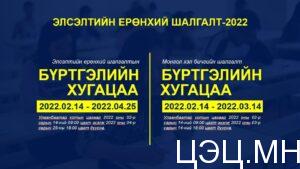 - Элсэлтийн ерөнхий шалгалтын бүртгэл www.eec.mn цахим хуудсаар орон даяар, Улаанбаатар хотын цагаар 2022 оны хоёрдугаар сарын 14-ний өглөө 09:00 цагт эхэлж, 2022 оны дөрөвдүгээр сарын 25-ны өдрийн 18:00 цагт дуусна. Бүртгэлийн хугацаа, цагийг сунгахгүй ба нэмэлт бүртгэл хийхгүй
