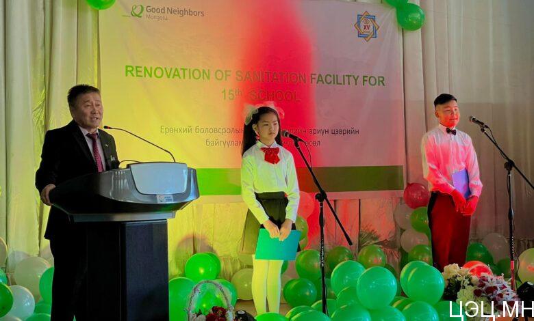 15-р сургууль бага, дунд ахлах ангийн сурагчддаа насныхан онцлогт нийцүүлсэн ариун цэврийн өрөөг тохижуулахад санхүүгийн дэмжлэг үзүүлсэн Good neighbors mongolia байгууллагат сургуулийн хамт олны зүгээс талархал илэрхийлж , сурагчид урлагийн номер үзүүлж нээлтэд оролцсон зочиддод бэлэв барив.