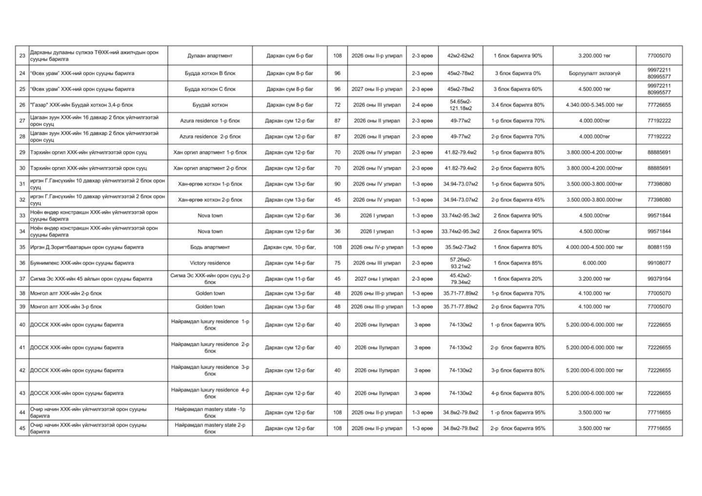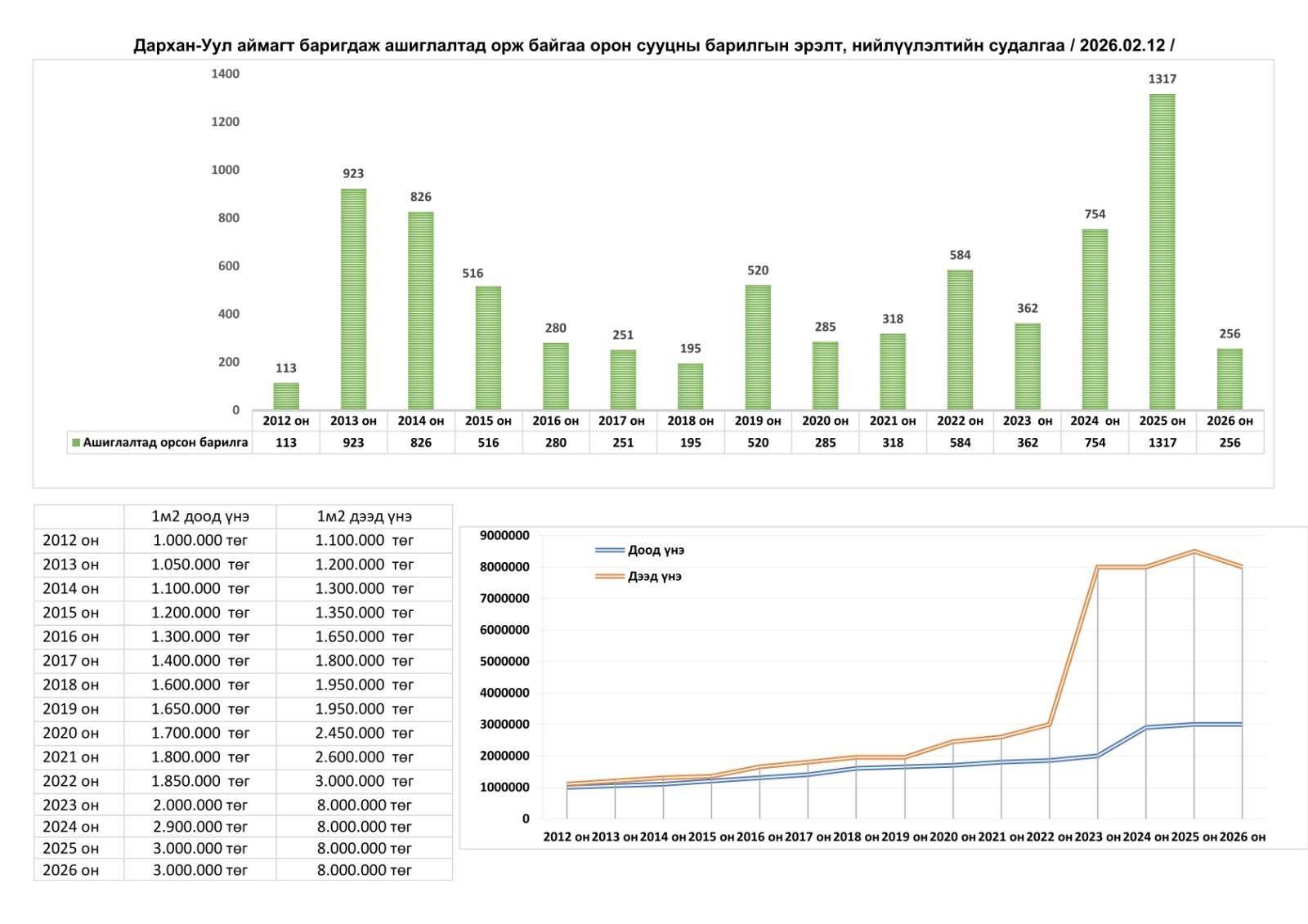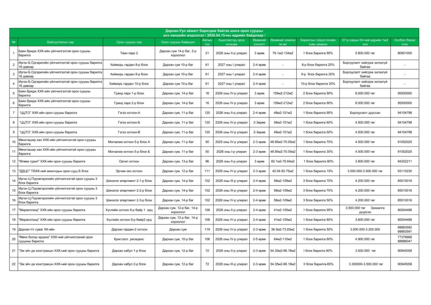 Дархан-Уул аймагт 2026 оны I улирлын байдлаар 39 байршилд 4886 айлын орон сууцны барилга баригдаж байна. Шинээр баригдаж байгаа орон сууцны 1м2-ийн хамгийн бага үнэ 3.000.000 байгаа бөгөөд дундаж үнэ 3.500.000-4.500.000 төгрөгний хооронд борлуулагдаж байна. 2025 онд 19 байршилд 1317 айлын орон сууцны барилга ашиглалтад орсон талаар аймгийн Газрын харилцаа, барилга хот байгуулалтын газраас мэдээллээ